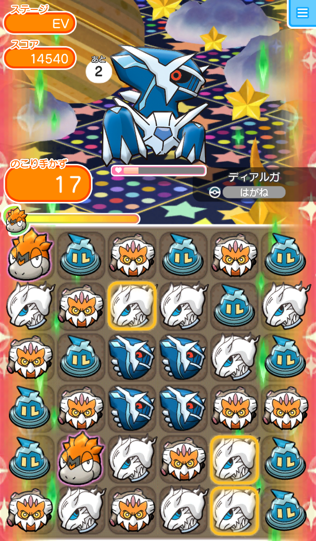 スーパーチャレンジ ディアルガ 開催期間 17年3月14日 (火)1500~3月28日 (火)1500 (JST) ステージ形式 手かず制 ステージ解放条件 メインステージ1(メガオニゴーリ)クリア むずかしさ ※★の数が多いほど難しいステージです。 (最大5個) ディアルガのイベントステージも再配信中! 15年10月5日(月) より、 「ポケとる」 のイベントステージに、伝説のポケモン 「パルキア」 が登場しました。 高難易度 の 「スーパーチャレンジ」 ステージとなっていて、パルキアの体力はかなり高く、オ ポケとる 配信元 ポケモン 配信日 ポケモンパズルゲーム『ポケとる』 ディアルガの「スキルパワー」を手に入れて、 伝説のポケモン